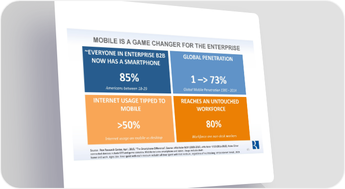 MOBILE IS A GAME CHANGER FOR THE ENTERPRISE ~EVERYONE IN ENTERPRISE B2B GLOBAL PENETRATION NOW HAS A SMARTPHONE 85% 1 –> 73% Americans between 18-29 Global Mobile PenetraAon 1995 - 2014 INTERNET USAGE TIPPED TO REACHES AN UNTOUCHED MOBILE WORKFORCE >50% 80% Internet usage on mobile vs desktop Workforce are non-desk workers Source: Pew Research Center, April, 2015, “The Smartphone Difference”. Source: eMarketer 9/14 (2008-2010), eMarketer 4/15 (2011-2015). Note: Other connected devices include OTT and game consoles. Mobile includes smartphone and tablet. Usage includes both 45 home and work. Ages 18+; Zme spent with each medium includes all Zme spent with that medium, regardless of mulZtasking. KPCB Internet trends, 2015