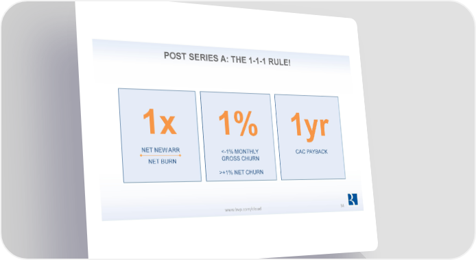 10 Laws of Building a Unicorn Page 33 Page 35POST SERIES A: THE 1-1-1 RULE! 1x 1% 1yr NET NEW ARR <-1% MONTHLY CAC PAYBACK NET BURN GROSS CHURN >+1% NET CHURN www.bvp.com/cloud 34