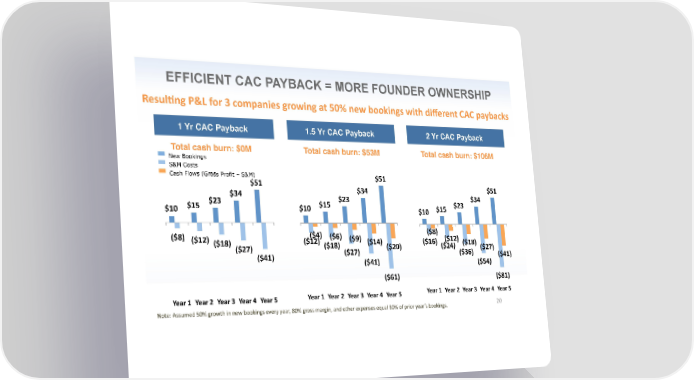EFFICIENT CAC PAYBACK = MORE FOUNDER OWNERSHIP ResulKng P&L for 3 companies growing at 50% new bookings with different CAC paybacks 1 Yr CAC Payback 1.5 Yr CAC Payback 2 Yr CAC Payback Total cash burn: $0M Total cash burn: $53M Total cash burn: $106M New Bookings S&M Costs Cash Flows (Gross Profit – S&M) $51 $51 $34 $51 $23 $34 $23 $34 $10 $15 $10 $15 $10 $15 $23 ($8) ($12) ($4) ($6) ($9) ($8) ($12) ($18) ($12) ($18) ($14) ($20) ($16) ($24) ($18) ($27) ($27) ($27) ($36) ($41) ($41) ($41) ($54) ($61) ($81) Year 1 Year 2 Year 3 Year 4 Year 5 Year 1 Year 2 Year 3 Year 4 Year 5 Year 1 Year 2 Year 3 Year 4 Year 5 20 Note: Assumed 50% growth in new bookings every year, 80% gross margin, and other expenses equal 80% of prior year’s bookings. 20
