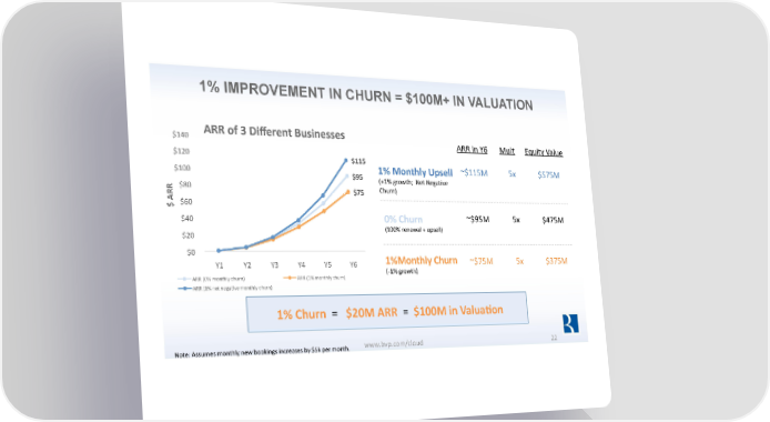 1% IMPROVEMENT IN CHURN = $100M+ IN VALUATION $140 ARR of 3 Diļ¬erent Businesses ARR in Y6 Mult Equity Value $120 $115 $100 1% Monthly Upsell ~$115M 5x $575M $95 (+1% growth; Net NegaZve $80 $75 Churn) ARR $60 $ $40 0% Churn ~$95M 5x $475M (100% renewal + upsell) $20 $0 1%Monthly Churn Y1 Y2 Y3 Y4 Y5 Y6 ~$75M 5x $375M (-1% growth) ARR (0% monthly churn) ARR (1% monthly churn) ARR (1% net negaZve monthly churn) 1% Churn = $20M ARR = $100M in ValuaKon Note: Assumes monthly new bookings increases by $5k per month. www.bvp.com/cloud 22