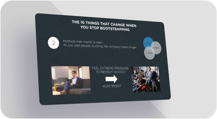 THE 10 THINGS THAT CHANGE WHEN YOU STOP BOOTSTRAPPING 2 Mythical man month is real— 1. People As you add people, building the company takes longer 2. Product 3. Process FEEL EXTREME PRESSURE TO RECRUIT QUICKLY MUST RESIST