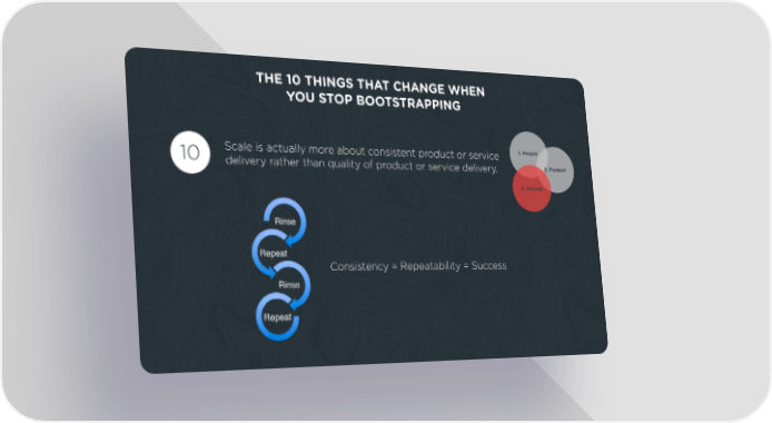 THE 10 THINGS THAT CHANGE WHEN YOU STOP BOOTSTRAPPING 10 Scale is actually more about consistent product or service 1. People delivery rather than quality of product or service delivery. 2. Product 3. Process Rinse Repeat Consistency = Repeatability = Success Rinse Repeat