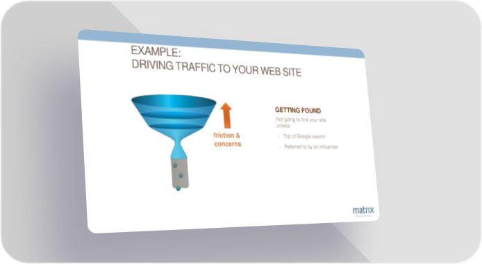 EXAMPLE: DRIVING TRAFFIC TO YOUR WEB SITE GETTING FOUND Not going to find your site unless: friction & - Top of Google search concerns - Referred to by an influencer