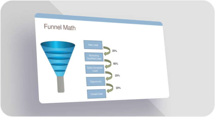 Funnel Math Raw Lead 20% Marketing Qualified Lead 80% Sales Accepted Lead 25% Opportunity 20% Closed Deal
