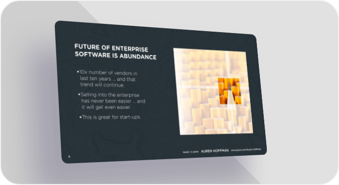 FUTURE OF ENTERPRISE SOFTWARE IS ABUNDANCE •10x number of vendors in last ten years … and that trend will continue. •Selling into the enterprise has never been easier ... and it will get even easier. •This is great for start-ups. 8 tweet: @ auren AUREN HOFFMAN www.quora.com/Auren-Hoffman