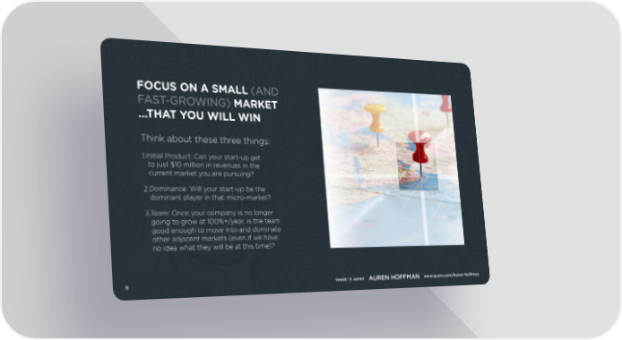 FOCUS ON A SMALL (AND FAST-GROWING) MARKET …THAT YOU WILL WIN Think about these three things: 1.Initial Product: Can your start-up get to just $10 million in revenues in the current market you are pursuing? 2.Dominance: Will your start-up be the dominant player in that micro-market? Team: Once your company is no longer 3. going to grow at 100%+/year, is the team good enough to move into and dominate other adjacent markets (even if we have no idea what they will be at this time)? 6 tweet: @ auren AUREN HOFFMAN www.quora.com/Auren-Hoffman