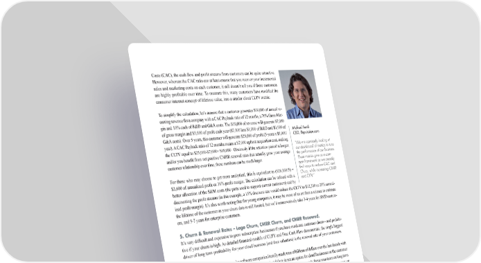 Costs (CAC), the cash flow and profit streams from customers can be quite attractive. However, whereas the CAC ratio can at least ensure that you recover your incremental sales and marketing costs on each customer, it still doesn’t tell you if these customers are highly profitable over time. To measure this, many customers have modified the consumer internet concept of lifetime value, into a similar cloud CLTV metric. To simplify the calculation, let’s assume that a customer generates $10,000 of annual re- curring revenue for a company with a CAC Payback ratio of 12 months, a 70% Gross Mar- gin and 10% each of R&D and G&A costs. The $10,000 of revenue will generate $7,000 of gross margin and $5,000 of profit each year ($7,000 less $1,000 of R&D and $1,000 of Michael Fertik G&A costs). Over 5 years, this customer will generate $25,000 of profit (5 years x $5,000/ CEO, Reputation.com year). A CAC Payback ratio of 12 months means a $7,000 upfront acquisition cost, making the CLTV equal to $25,000-$7,000= $18,000 Obviously if the retention period is longer, “We are constantly looking at and/or you benefit from net positive CMRR renewal rates that actually grow your average our dashboard of metrics to tune the performance of our business. customer relationship over time, these numbers can be much larger. These metrics give us a com- mon framework as we steadily For those who may choose to get more analytical, this is equivalent to ($18,000/5) = find ways to reduce CAC and $3,600 of annualized profit or 36% profit margin. The calculation can be refined with a Churn, while increasing CMRR and CLTV.” better allocation of the S&M costs (the parts used to support current customers) and by discounting the profit streams (in this example, a 15% discount rate would reduce the CLTV to $12,300 or 25% annual- ized profit margin). It’s also worth noting that for young companies, it may be more of an art than a science to estimate the lifetime of the customer as your churn data is still limited, but we’d conservatively take 3-4 years for SMB custom- ers, and 5-7 years for enterprise customers. 5. Churn & Renewal Rates – Logo Churn, CMRR Churn, and CMRR Renewed. It’s very difficult and expensive to grow subscription businesses if you have moderate customer churn-- and prohibi- tive if your churn is high. As detailed financial models of CLTV and Free Cash Flow demonstrate, the single biggest driver of long term profitability for your cloud business (and thus valuation) is the renewal rate of your customers. Whereas the largest legacy enterprise software companies literally made tens of billions of dollars over the last decade with “shelf-ware” projects that never got fully implemented, project failure is not an option for cloud businesses or the customer will simply turn you off, regardless of the contract terms. This is another reason not to overly focus your team on long term contracts, because it creates a false sense of customer lock-in regarding your unhappy customers, and may leave money on the table from lost upsell opportunities with your happiest customers. Over time when you have successfully realized most of the upsell potential of your accounts and have built in deep ties to the account, you may want to push for longer term contracts for predictability (which Wall Street does still value), but this shouldn’t come at the expense of CMRR. Cloud executives need to track renewal rates in detail to capture “logos lost” (lost customers) as well as the percentages of CMRR renewed and lost. The standard approach is three key sub-metrics, all related to this concept of renewal rate: Logo Churn %: This is a percentage calculation of all your customer names (“logos”) that have churned over the measured time period. If you started the year with 500 customers and 460 of them were still paying customers at some level at the end of the year, then you have churn of 40 customers and your annual Logo Churn is 8% (40/500). Bessemer Venture Partners 13