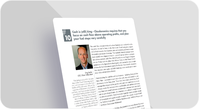 # Cash is (still) king – Cloudonomics requires that you 10 focus on cash flow above operating profits, and plan your fuel stops very carefully The cash flow characteristics of a cloud business are wonderful in the long term, but can be lousy in the short term. Cloud companies require you to fund research, development, sales and marketing up front in return for a multi-year stream of revenue. This typically demands enough invest- ment capital (over stages) to fund 4+ years of runway before a company can achieve positive cash flow (GAAP profit is even longer). Imagine you are flying a private plane from Silicon Valley to Wall Street (which sometimes is the figurative or literal goal), and you need to stop a couple of times for fuel (investment capital) for the trip. It is critically important Greg Becker that you plan your equity and debt financing events in advance to maxi- CEO, Silicon Valley Bank mize value and minimize dilution. “We believe we’re still in the early Understanding the cash flows of your business – including Gross and Net days of the Cloud Computing revolu- Burn Rate – is critical to survival in the early days and critical to your tion, and are eager to bank the future dominance in the long term. There have been many promising cloud leaders of this next wave. We are big startups that stepped on the gas too early and were wiped out as a result. supporters of Bessemer’s cloud metrics and laws, and have actually developed Always model the business with a comfortable cash cushion and recog- specialized lending products designed nize that most cloud businesses paradoxically consume more short-term around them. We have already loaned cash as growth accelerates. As a business, it is critical to weigh forward tens of millions of dollars to Bessemer investments carefully. Cloud businesses typically require multiple rounds companies behind these metrics, often in cases where other banks couldn’t be of investment and a good amount of capital. For example, it took $126M competitive because they still focused for NetSuite to go public, $61M for Salesforce.com, $41M for Eloqua, and on legacy software metrics.” $45M for Cornerstone OnDemand. We are now seeing a second generation of cloud businesses that have the potential to be more efficient than many of their predecessors by leveraging Platform-as-a-Service (PaaS) and Infrastructure-as-a-Service (IaaS) to out- source more and shift many startup costs to variable models. However, even in most of these cases, significant Steven Kokinos CEO, ThinkingPhones “We were able to grow ThinkingPhones into a profitable business off of some very modest friends and family capital years ago. However, our CAC and CLTV metrics were good and our market is massive, so we decided to raise money from Bessemer to re- ally lean into the business to seize the full opportunity.” Bessemer Venture Partners 24