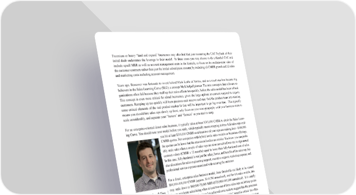 Freemium or heavy “land and expand” businesses may also find that just measuring the CAC Payback of their initial deals understates the leverage in their model. In those cases you may choose to do a blended CAC and include upsell MRR as well as account management costs in the formula, or focus on the medium-term value of the customer contracts rather than just the initial subscription amount, by including all CMRR growth and all sales and marketing costs including account management. Years ago, Bessemer was fortunate to invest behind Mark Leslie at Veritas, and as a result our firm became big believers in the Sales Learning Curve (SLC), a concept Mark helped pioneer. The core concept is that software or- ganizations often fail because they staff up their sales efforts too quickly, before the sales model has been refined. This concept is even more critical for cloud businesses, given the large upfront investment required to acquire customers. Ramping up too quickly will burn precious cash reserve and may fool the product team into missing some critical elements of the real product market fit that will be important to go big over time. This typically means you should hire sales reps slowly up front, only focus on your core geography until your business starts to scale considerably, and separate your “hunters” and “farmers” as you start to ramp. For an enterprise-oriented direct sales business, it typically takes at least $300,000 CMRR to climb the Sales Learn- ing Curve. You should tune your model before you scale, which typically means stopping at three field sales reps until you hit at least $300,000 CMRR or at least two of your reps are making their ~$100,000 CMRR quotas. For companies with hybrid inside sales models or freemium offerings, the quotas can be lower but the attainment hurdles are similar. You know you can profit- ably scale sales when a couple of sales reps are at an annualized run rate to sign annual contract values (CMRR x 12 months) equal to twice their fully-burdened cost of sales. In this case, fully-burdened is not just the salary, bonus, and benefits of the sales rep, but also allocations for sales engineering support, executive support, marketing expense, and professional service expenses associated with securing the customer. For a direct, enterprise sales business model, these thresholds are likely to be around $80,000-100,000 CMRR (approx. $1-1.2M annualized), and for tele-sales models, this Russell Glass may scale down to $60,000-75,000 MRR ($720,000-900,000 annualized). It is usually CEO, Bizo time to accelerate sales hiring when at least two out of three sales reps are hitting quotas at these numbers, and the business has achieved some scale to suggest that the processes “As an online B2B marketing are repeatable- at least $300,000 of CMRR. The “repeatable” aspect is critical: too often business, sales and marketing companies scale their sales forces aggressively after their first senior rep is getting traction efficiency is our lifeblood. in the market and then quickly realize that the new hires struggle to sign their first deal We have to be able to justify the ROI on each incremental because they don’t have three VP’s and the CEO alongside them. marketing dollar our custom- ers spend with us, so the You should also separate your “hunters” and “farmers” and pay them all on CMRR performance metrics are very growth. As soon as you have climbed the Sales Learning Curve and have a sizeable important. We have also managed to run the business customer base, you should supplement your sales force with renewal-oriented account near cashflow breakeven managers. When a cloud company starts to hit the sales inflection point, it is important since the very early days, to keep the new business reps (the “hunters”) busy with finding new deals, while a team so every new sales hire is of account managers (the “farmers”) tends to the established customers. The new ac- expected to return a multiple back to the business.” count team should be paid on new CMRR with a standard deal structure (such as a one Bessemer Venture Partners 16