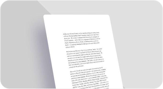 At Bessemer Venture Partners, we have had the privilege of working closely with over 50 of the leading Cloud Computing companies over more than a dozen years. We continue to fundamentally believe that the emergence of Cloud Computing – and its three core components of Software-as-a-Service (SaaS), Platform-as-a-Service (PaaS), and Infrastructure-as-a-Service (IaaS) – is completely changing the landscape of the multi-billion dollar software industry. We first presented Bessemer’s Top 10 Laws for Being “SaaS-y” for internal discussion at our annual Cloud/SaaS CEO Summit almost five years ago, and were overwhelmed by requests to share the content more broadly. We decided to not only share the insights and the discussion openly, but to treat this as an active dialogue with ongoing updates to reflect the collec- tive learning of the cloud community. This update is the most extensive we have ever undertaken, and includes many changes and several entirely new concepts for this publication. This work is literally the result of thousands of conversations that the partners of Bessemer have participated in with cloud executives, including our past and current portfolio companies, as well as other leading public and private cloud companies. We have been fortunate to be investors in many of the early cloud winners - such as LinkedIn (LNKD), Cornerstone OnDemand (CSOD), Broadsoft (BSFT), Eloqua (ELOQ), Lifelock (LOCK), Postini (Acq: Google), Netli (Acq: Akamai), Trigo (Acq: IBM), Keynote (KEYN), Cyota (Acq: RSA), and Verisign (Acq:SYMC) - and continue to ac- tively invest behind one of the largest cloud portfolios in the venture capital industry. We don’t claim to be brilliant on these topics ourselves, but we do believe this full community – and thus the content - represents the leading thinking from true cloud experts. Periods of tremendous transformation create tremendous opportunity, and we consider ourselves privileged to be working with many of the great entrepreneurs who are currently creating the next giants of the “software” industry. We welcome your thoughts and feedback at cloudvc@bvp.com and also invite you to visit the Cloud Computing section of our website at www.bvp.com/cloud. Bessemer Venture Partners 3