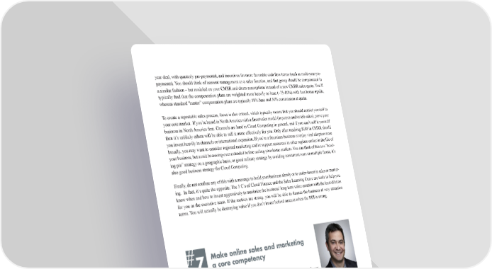 year deal, with quarterly pre-payments), and incentives for more favorable cash flow terms (such as multi-year pre- payments). You should think of account management as a sales function, and that group should be compensated in a similar fashion – but modeled on your CMRR and churn assumptions instead of a new CMRR sales quota. You’ll typically find that the compensation plans are weighted more heavily to base (~75-80%) with less bonus upside, whereas standard “hunter” compensation plans are typically 50% base and 50% commission at quota. To create a repeatable sales process, focus is also critical, which typically means that you should restrict yourself to your core market. If you’re based in North America with a direct sales model (in person and/or tele-sales), prove your business in North America first. Channels are hard in Cloud Computing in general, and if you can’t sell it yourself then it’s unlikely others will be able to sell it more effectively for you. Only after reaching $1M in CMRR should you invest heavily in channels or international expansion. If you’re a freemium business or enjoy viral adoption more broadly, you may want to consider regional marketing and/or support resources in other regions earlier in the life of your business, but avoid becoming over extended before nailing your home markets. You can think of this as a “bowl- ing pin” strategy on a geographic basis, or good military strategy by avoiding concurrent wars on multiple fronts; it’s also good business strategy for Cloud Computing. Finally, do not confuse any of this with a message to build your business slowly or to under-invest in sales or market- ing. In fact, it’s quite the opposite. The 5 C’s of Cloud Finance and the Sales Learning Curve are tools to help you know when and how to invest aggressively to maximize the business’ long term value creation with the least dilution for you as the executive team. If the metrics are strong, you will be able to finance the business at very attractive terms. You will actually be destroying value if you don’t invest behind success when the ROI is strong. #7 Make online sales and marketing a core competency You’re a cloud business, so by definition, your sales prospects are all online. Savvy online sales and marketing is a core competency (sometimes the only one) of every successful cloud business. Amir Ashkenazi Numerous studies show that your customers are now doing most of their primary re- CEO, Adap.tv search online, and this should not surprise you. As a consumer, you wouldn’t imagine “We’re still in the very early days buying a car, making an offer on a home, planning a vacation, or completing other large of the online advertising revolution purchases without doing some research online. The same is now true for executives at and the flood of dollars continue your target customers. You should therefore be aggressive in marketing to them online. to move to online display, video, mobile, and social at rapid rates. Your prospects are online, so your This is a clear example where business-to-business (B2B) marketers need to learn from marketing and sales efforts should their business-to-consumer (B2C) counterparts. The most innovative B2C companies be as well.” Bessemer Venture Partners 17