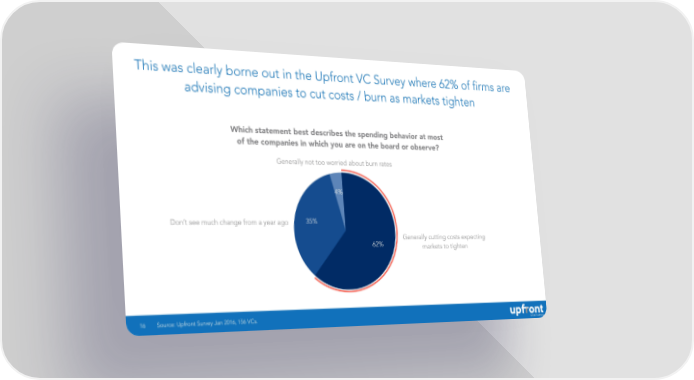 This was clearly borne out in the Upfront VC Survey where 62% of firms are advising companies to cut costs / burn as markets tighten Which statement best describes the spending behavior at most of the companies in which you are on the board or observe? Generally not too worried about burn rates 4% Don’t see much change from a year ago 35% Generally cutting costs expecting 62% markets to tighten 16 Source: Upfront Survey Jan 2016, 156 VCs.