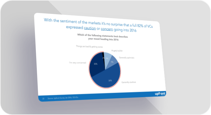 With the sentiment of the markets it’s no surprise that a full 82% of VCs expressed caution or concern going into 2016 Which of the following statements best describes your mood heading into 2016 Things are bad & getting worse Hugely bullish 2% 9% Generally optimistic I’m very concerned 9% 30% 50% Generally cautious 22 Source: Upfront Survey Jan 2016, 155 VCs.