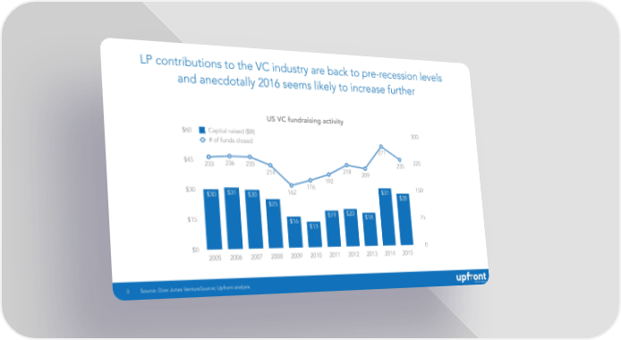 LP contributions to the VC industry are back to pre-recession levels and anecdotally 2016 seems likely to increase further US VC fundraising activity $60 Capital raised ($B) 300 # of funds closed 271271 $45 233233 236236 235235 235235 225 214214 218218 209209 192192 $30 162162 176176 150 $30 $31 $30 $31 $28 $25 $15 $19 $20 $18 75 $16 $13 $0 0 2005 2006 2007 2008 2009 2010 2011 2012 2013 2014 2015 3 Source: Dow Jones VentureSource; Upfront analysis.