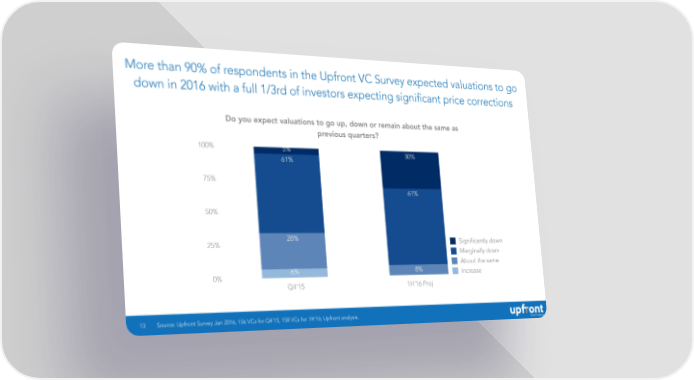 More than 90% of respondents in the Upfront VC Survey expected valuations to go down in 2016 with a full 1/3rd of investors expecting significant price corrections Do you expect valuations to go up, down or remain about the same as previous quarters? 100% 5% 30% 61% 75% 61% 50% 28% Significantly down 25% Marginally down About the same 0% 6% 8% Increase Q4'15 1H'16 Proj 13 Source: Upfront Survey Jan 2016, 156 VCs for Q4’15, 158 VCs for 1H’16; Upfront analysis.