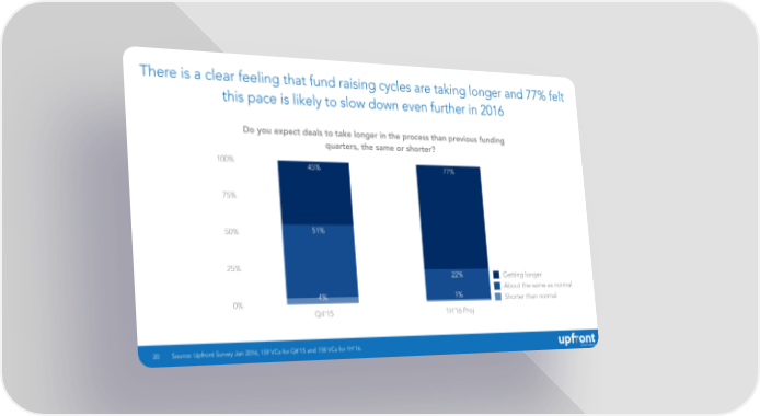 There is a clear feeling that fund raising cycles are taking longer and 77% felt this pace is likely to slow down even further in 2016 Do you expect deals to take longer in the process than previous funding quarters, the same or shorter? 100% 45% 77% 75% 50% 51% 25% 22% Getting longer About the same as normal 0% 4% 1% Shorter than normal Q4'15 1H'16 Proj 20 Source: Upfront Survey Jan 2016, 159 VCs for Q4’15 and 158 VCs for 1H’16.
