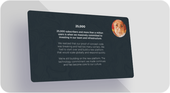 25,000 25,000 subscribers and more than a million users is when we massively committed to investing in our team and infrastructure. We realized that our proof of concept code was breaking and had too many corners. We had to start over and build a new platform that would scale globally and respond quickly. We’re still building on the new platform. The technology commitment we made continues and has become core to our culture.
