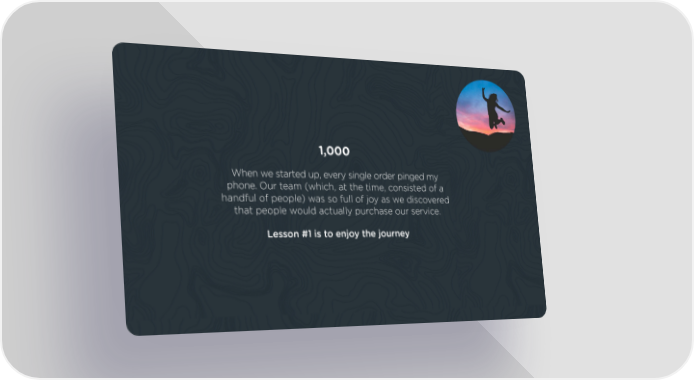 1,000 When we started up, every single order pinged my phone. Our team (which, at the time, consisted of a handful of people) was so full of joy as we discovered that people would actually purchase our service. Lesson #1 is to enjoy the journey