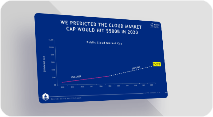 WE PREDICTED THE CLOUD MARKET CAP WOULD HIT $500B IN 2020 $1,200 Public Cloud Market Cap $1,000 $800 Capt e $600 $500B Mark$B $400 $200 $0 2010 2011 2012 2013 2014 2015 2016 2017 2018 2019 2020 S A A S T R A N N U A L 2 0 1 9 S o u r c e : C a p I Q a n d P i t c h b o o k