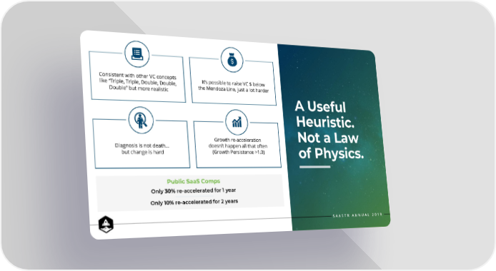 Consistent with other VC concepts It’s possible to raise VC $ below like “Triple, Triple, Double, Double, the Mendoza Line, just a lot harder Double” but more realistic A Useful Heuristic. Growth re-acceleration Not a Law Diagnosis is not death… doesn’t happen all that often but change is hard (Growth Persistence >1.0) of Physics. Public SaaS Comps Only 30%re-accelerated for 1 year Only 10%re-accelerated for 2 years