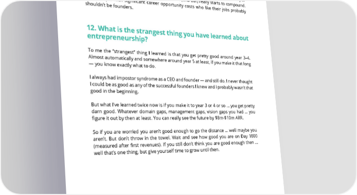 your opportunity cost. Beyond that you’re into Upside and Bonus. This assumes you’ve left a real career with real potential advancement to do a raw start-up. To repeat -- this is very hard. There are less than 40-50, $100m+ Internet exits per year, and as you get into years 4, 5, 6 the math (and bar) really starts to compound. Most people with significant career opportunity costs who like their jobs probably shouldn’t be founders. 12. What is the strangest thing you have learned about entrepreneurship? To me the “strangest” thing I learned is that you get pretty good around year 3–4. Almost automatically and somewhere around year 5 at least, if you make it that long — you know exactly what to do. I always had impostor syndrome as a CEO and founder — and still do. I never thought I could be as good as any of the successful founders I knew and I probably wasn’t that good in the beginning. But what I’ve learned twice now is if you make it to year 3 or 4 or so … you get pretty darn good. Whatever domain gaps, management gaps, vision gaps you had … you figure it out by then at least. You can really see the future by $8m-$10m ARR. So if you are worried you aren’t good enough to go the distance … well maybe you aren’t. But don’t throw in the towel. Wait and see how good you are on Day 1000 (measured after first revenues). If you still don’t think you are good enough then … well that’s one thing, but give yourself time to grow until then. SAASTR.COM 11