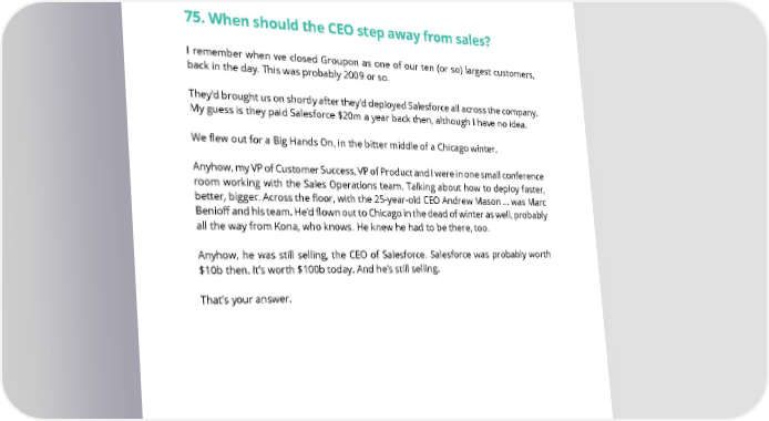 boss doesn’t say the rep was great, simply pass. And if practical, ask to talk to a customer / ex-customer, ideally one that has bought more than once. If both tell you this is one of the better reps they’ve hired/worked with, and it’s at a similar price point to your product -- you’re in good shape. 75. When should the CEO step away from sales? I remember when we closed Groupon as one of our ten (or so) largest customers, back in the day. This was probably 2009 or so. They’d brought us on shortly after they’d deployed Salesforce all across the company. My guess is they paid Salesforce $20m a year back then, although I have no idea. We flew out for a Big Hands On, in the bitter middle of a Chicago winter. Anyhow, my VP of Customer Success, VP of Product and I were in one small conference room working with the Sales Operations team. Talking about how to deploy faster, better, bigger. Across the floor, with the 25-year-old CEO Andrew Mason … was Marc Benioff and his team. He’d flown out to Chicago in the dead of winter as well, probably all the way from Kona, who knows. He knew he had to be there, too. Anyhow, he was still selling, the CEO of Salesforce. Salesforce was probably worth $10b then. It’s worth $100b today. And he’s still selling. That’s your answer. SAASTR.COM 72