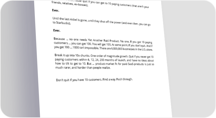 66. As a startup CEO, how do you decide whether to keep pushing on with it or admit defeat knowing that most startups fail? Never, ever, ever, never quit if you can get to 10 paying customers (that aren’t your friends, relatives, ex-bosses). Ever. Until the last nickel is gone, until they shut off the power (and even then, you can go to Starbucks). Ever. Because ... no one needs Yet Another Paid Product. No one. If you got 10 paying customers ... you can get 100. You will get 100. At some point. If you don’t quit. And if you get 100 ... 1000 isn’t impossible. There are 6,000,000 businesses in the U.S. alone. Break it up into 10x chunks. One order of magnitude growth. Quit if you never get 10 paying customers within 6, 12, 24, 200 months of launch, and have no ideas about how to tilt to get to 10. But ... product-market fit for paid SaaS products is just so much rarer, and harder than people realize. Don’t quit if you have 10 customers. Find a way. Push through. SAASTR.COM 63