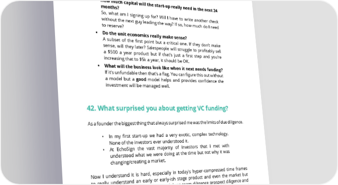 • Is getting to $100m at least plausible? Or do the assumptions make no sense at all? It’s OK if the odds are low but if they are zero -- you gotta pass as a VC. There has to at least be a hope of a 10x+ return if all expectations are met or exceeded. • How much capital will the start-up really need in the next 24 months? So, what am I signing up for? Will I have to write another check without the next guy leading the way? If so, how much do I need to reserve? • Do the unit economics really make sense? A subset of the first point but a critical one. If they don’t make sense, will they later? Salespeople will struggle to profitably sell a $500 a year product but if that’s just a first step and you’re increasing that to $5k a year, it should be OK. • What will the business look like when it next needs funding? If it’s unfundable then that’s a flag. You can figure this out without a model but a good model helps and provides confidence the investment will be managed well. 42. What surprised you about getting VC funding? As a founder the biggest thing that always surprised me was the limits of due diligence. • In my first start-up we had a very exotic, complex technology. None of the investors ever understood it. • At EchoSign the vast majority of investors that I met with understood what we were doing at the time but not why it was changing/creating a market. Now I understand it is hard, especially in today’s hyper-compressed time frames to really understand an early or early-ish stage product and even the market but the VCs weren’t lazy. They did a great job on team diligence prospect diligence and customer diligence. Going an extra layer deeper on diligence was what I expected before getting a seven-figure check but in reality — not so much. SAASTR.COM 37
