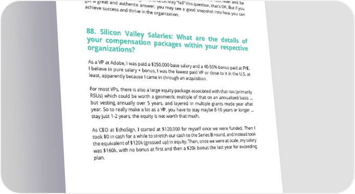 87. What are some awesome questions to ask a CEO of a startup during an interview? Ask how she develops talent, how she helps people grow to the next level and be their best. First time managers and CEOs may “fail” this question, that’s OK. But if you get a great and authentic answer, you may see a good snapshot into how you can achieve success and thrive in the organization. 88. Silicon Valley Salaries: What are the details of your compensation packages within your respective organizations? As a VP at Adobe, I was paid a $250,000 base salary and a 40-50% bonus paid at FYE. I believe in pure salary + bonus, I was the lowest paid VP or close to it in the U.S. at least, apparently because I came in through an acquisition. For most VPs, there is also a large equity package associated with that too (primarily RSUs) which could be worth a geometric multiple of that on an annualized basis ... but vesting annually over 5 years, and layered in multiple grants made year after year. So to really make a lot as a VP, you have to stay maybe 8-10 years or longer ... stay just 1-2 years, the equity is not worth that much. As CEO at EchoSign, I started at $120,000 for myself once we were funded. Then I took $0 in cash for a while to stretch our cash to the Series B round, and instead took the equivalent of $120k (grossed up) in equity. Then, once we were at scale, my salary was $160k, with no bonus at first and then a $20k bonus the last year for exceeding plan. SAASTR.COM 86