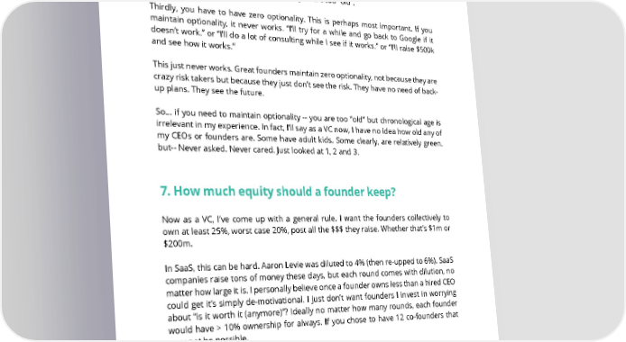in the office 14 hours days. That’s not really necessary but to obsessively thinking, worrying, futzing, stressing about how to do the impossible. Every. Single. Moment of the day. If you don’t have the mental bandwidth -- you are too “old”. Thirdly, you have to have zero optionality. This is perhaps most important. If you maintain optionality, it never works. “I’ll try for a while and go back to Google if it doesn’t work.” or “I’ll do a lot of consulting while I see if it works.” or “I’ll raise $500k and see how it works.” This just never works. Great founders maintain zero optionality, not because they are crazy risk takers but because they just don’t see the risk. They have no need of back- up plans. They see the future. So... if you need to maintain optionality -- you are too “old” but chronological age is irrelevant in my experience. In fact, I’ll say as a VC now, I have no idea how old any of my CEOs or founders are. Some have adult kids. Some clearly, are relatively green. but-- Never asked. Never cared. Just looked at 1, 2 and 3. 7. How much equity should a founder keep? Now as a VC, I’ve come up with a general rule. I want the founders collectively to own at least 25%, worst case 20%, post all the $$$ they raise. Whether that’s $1m or $200m. In SaaS, this can be hard. Aaron Levie was diluted to 4% (then re-upped to 6%). SaaS companies raise tons of money these days, but each round comes with dilution, no matter how large it is. I personally believe once a founder owns less than a hired CEO could get it’s simply de-motivational. I just don’t want founders I invest in worrying about “is it worth it (anymore)”? Ideally no matter how many rounds, each founder would have > 10% ownership for always. If you chose to have 12 co-founders that may not be possible. But that’s my goal. So I just don’t invest in companies where this will likely be structurally impossible. I like companies that were able to skip a round. SAASTR.COM 7