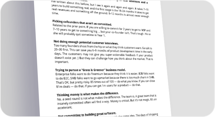 67. What do startup founders typically get wrong when starting a business? Not committing to 24 months upfront to getting to Real Revenues and a Minimum Sellable Product. I’ve written about this before, but I see it again and again and again. It takes 7–10 years to build something real, and the first stage is the 18–24 months it takes to get real revenues and something off the ground. 8–12 months is almost never enough time. Picking cofounders that aren’t as committed. Related to the prior point. If you are willing to commit for 2 years to get to MSP and 7–10 years to get to something big … but your co-founder isn’t. That’s tough. He or she will probably quit sometime in Year 1. Not doing enough potential customer interviews. Too many founders shoot from the hip on what they think customers want. Go talk to 20–30 first. This can save you 6–9 months of product development time in the early days. The customers may not give you super-actionable feedback if your product doesn’t exist yet ;) But they can challenge how you think about the market. That is important. Trying to pursue a “Grass is Greener” business model. Enterprise folks want to do freemium because they think it is easier. B2B folks want to do B2C. SMB folks want to go upmarket because there is too much churn in SMB. That’s OK, but pretty risky. 85 times out of 100 — do what you know. If you can close $1m deals — do that. If you can get 1m users for a product — do that. Thinking money is what makes the difference. No, a seed round is not what makes the difference. The team is. A great team that is insanely committed often will find a way. Money is critical. But it’s not magic. It’s an accelerant. Not committing to building great software. There are probably 10–100 other startups with the same idea. The days of shipping crummy software IMHO at least are sort of over. Are you committed to building a truly great product? Yes, we all start with a hack. But how are you going to ship world- class software in the early-ish days? If you don’t know how you’ll be eclipsed by those that do. SAASTR.COM 64