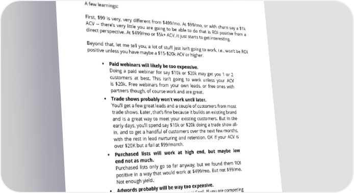53. What are some best practices for SaaS lead generation? How should a startup approach lead generation for a SaaS product that sells in the $99-$499/ month range? A few learnings: First, $99 is very, very different from $499/mo. At $99/mo, or with churn say a $1k ACV -- there’s very little you are going to be able to do that is ROI positive from a direct perspective. At $499/mo or $5k+ ACV, it just starts to get interesting. Beyond that, let me tell you, a lot of stuff just isn’t going to work, i.e., won’t be ROI positive unless you have maybe a $15-$20k ACV or higher: • Paid webinars will likely be too expensive. Doing a paid webinar for say $10k or $20k may get you 1 or 2 customers at best. This isn’t going to work unless your ACV is $20k. Free webinars from your own leads, or free ones with partners though, of course work and are great. • Trade shows probably won’t work until later. You’ll get a few great leads and a couple of customers from most trade shows. Later, that’s fine because it builds an existing brand and is a great way to meet your existing customers. But in the early days, you’ll spend say $10k or $20k doing a trade show all- in, and to get a handful of customers over the next few months, with the rest in lead nurturing and retention. OK if your ACV is over $20K but a fail at $99/month. • Purchased lists will work at high end, but maybe low end not as much. Purchased lists only go so far anyway, but we found them ROI positive in a way that would work at $499/mo. But not $99/mo. Not enough yield. • Adwords probably will be way too expensive. All the key terms are very expensive in SaaS. If you are competing with say Marketo with a $50k ACV for the same keyword (just making this up as an example) -- you’ll lose every time, every bid. All the good SaaS keywords are $1-$5 each. Assume a 2% conversion ratio or whatever number, and this just won’t work at $99/month and will be pretty tight at $499/month. Again, works SAASTR.COM 48