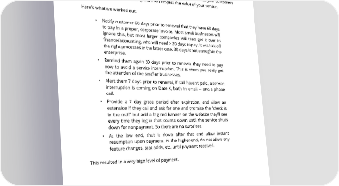 56. What can a startup do to get their customers to pay on time? We found it pretty easy once we worked out a good process. Treat your customers with respect, be understanding and then respect the value of your service. Here’s what we worked out: • Notify customer 60 days prior to renewal that they have 60 days to pay in a proper, corporate invoice. Most small businesses will ignore this, but most larger companies will then get it over to finance/accounting, who will need > 30 days to pay. It will kick off the right processes in the latter case. 30 days is not enough in the enterprise. • Remind them again 30 days prior to renewal they need to pay now to avoid a service interruption. This is when you really get the attention of the smaller businesses. • Alert them 7 days prior to renewal, if still haven’t paid, a service interruption is coming on Date X, both in email -- and a phone call. • Provide a 7 day grace period after expiration, and allow an extension if they call and ask for one and promise the “check is in the mail” but add a big red banner on the website they’ll see every time they log in that counts down until the service shuts down for nonpayment. So there are no surprises • At the low end, shut it down after that and allow instant resumption upon payment. At the higher-end, do not allow any feature changes, seat adds, etc. until payment received. This resulted in a very high level of payment. SAASTR.COM 52