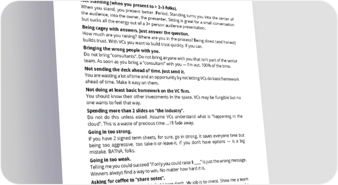 23. What are some rookie mistakes founders make during VC meetings? RAISING A few that are easy to fix: CAPITAL Not standing (when you present to > 2–3 folks). When you stand, you present better. Period. Standing turns you into the center of the audience, into the owner, the presenter. Sitting is great for a small conversation but sucks all the energy out of a 3+ person audience presentation. Being cagey with answers. Just answer the question. How much are you raising? Where are you in the process? Being direct (and honest) builds trust. With VCs you want to build trust quickly, if you can. Bringing the wrong people with you. Do not bring “consultants”. Do not bring anyone with you that isn’t part of the senior team. As soon as you bring a “consultant” with you — I’m out. 100% of the time. Not sending the deck ahead of time. Just send it. You are wasting a lot of time and an opportunity by not letting VCs do basic homework ahead of time. Make it easy on them. Not doing at least basic homework on the VC firm. You should know their other investments in the space. VCs may be fungible but no one wants to feel that way. Spending more than 2 slides on “the industry”. Do not do this unless asked. Assume VCs understand what is “happening in the cloud”. This is a waste of precious time … I’ll fade away. Going in too strong. If you have 2 signed term sheets, for sure, go in strong. It saves everyone time but being too aggressive, too take-it-or-leave-it, if you don’t have options — is a big mistake. BATNA, folks. Going in too weak. Telling me you could succeed “if only you could raise $____” is just the wrong message. Winners always find a way to win. No matter how hard it is. Asking for coffee to “share notes”. Some VCs may want to do this but I sure don’t. My job is to invest. Show me a team and product I want to invest in — I’m in. I already drink 4 cups a day. I don’t need a 5th. Hearing about how the founders met in elementary school. Even if this is true I don’t want to hear it, at least not as a part of the core pitch. That’s not a positive for me. Meeting at Google or Salesforce is a positive. Meeting at SAASTR.COM 21