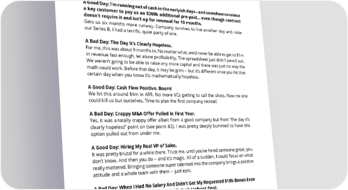 8. As a CEO, what is an example of a good day and of a bad one? I’ll give a few from the early days. This is pretty fun: A Good Day: I’m running out of cash in the earlyish days-- and somehow convince a key customer to pay us an $300k additional pre-paid... even though contract doesn’t require it and isn’t up for renewal for 10 months. Gets us six months more runway. Company survives to live another day and raise our Series B. I had a terrific, quiet party of one. A Bad Day: The Day It’s Clearly Hopeless. For me, this was about 9 months in. No matter what, we’d never be able to get to $1m in revenue fast enough, let alone profitability. The spreadsheet just didn’t pencil out. We weren’t going to be able to raise any more capital and there was just no way the math could work. Before that day, it may be grim -- but it’s different once you hit that certain day when you know it’s mathematically hopeless. A Good Day: Cash Flow Positive. Boom! We hit this around $4m in ARR. No more VCs getting to call the shots. Now no one could kill us but ourselves. Time to plan the first company retreat! A Bad Day: Crappy M&A Offer Pulled in First Year. Yes, it was a totally crappy offer albeit from a good company but from “the day it’s clearly hopeless” point on (see point #2), I was pretty deeply bummed to have this option pulled out from under me. A Good Day: Hiring My Real VP of Sales. It was pretty brutal for a while there. Trust me, until you’ve hired someone great, you don’t know. And then you do -- and it’s magic. All of a sudden, I could focus on what really mattered. Bringing someone super talented into the company brings a positive attitude and a whole team with them -- just epic. A Bad Day: When I Had No Salary And Didn’t Get My Requested $10k Bonus Even Though I Brought In an Extra $250k All-Cash Upfront Deal. Argh. A Good Day: Dec 31, 2009; Dec 31, 2010; Dec 31, 2011; Dec 31, 2012. When we killed it every year on the last day of the year. Exceeded the plan and our own expectations. New Years was spent in the office. It was just too fun to see the SAASTR.COM 8
