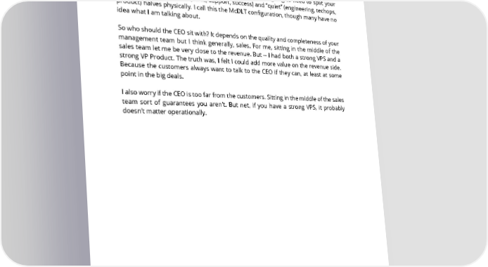 90. In a SaaS company, should the CEO sit with engineering/product, with sales, or with the exec team? As soon as you get even a handful of sales reps, you’re going to need to split your SaaS company into “loud” (sales, support, success) and “quiet” (engineering, techops, product) halves physically. I call this the McDLT configuration, though many have no idea what I am talking about. So who should the CEO sit with? It depends on the quality and completeness of your management team but I think generally, sales. For me, sitting in the middle of the sales team let me be very close to the revenue. But -- I had both a strong VPS and a strong VP Product. The truth was, I felt I could add more value on the revenue side. Because the customers always want to talk to the CEO if they can, at least at some point in the big deals. I also worry if the CEO is too far from the customers. Sitting in the middle of the sales team sort of guarantees you aren’t. But net, if you have a strong VPS, it probably doesn’t matter operationally. SAASTR.COM 88