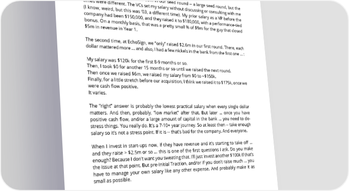 89. How does a CEO/founder/owner pick their salary? I’ll share my stories. In my first start-up, we raised $9m in our seed round -- a large seed round, but the times were different. The VCs set my salary without discussing or consulting with me (I know, weird, but this was ‘03, a different time). My prior salary as a VP before the company had been $150,000, and they raised it to $180,000, with a performance-tied bonus. On a monthly basis, that was a pretty small % of $9m for the guy that closed $5m in revenue in Year 1. The second time, at EchoSign, we “only” raised $2.6m in our first round. There, each dollar mattered more ... and also, I had a few nickels in the bank from the first one ... : My salary was $120k for the first 8-9 months or so. Then, I took $0 for another 15 months or so until we raised the next round. Then once we raised $6m, we raised my salary from $0 to ~$150k. Finally, for a little stretch before our acquisition, I think we raised it to $175k, once we were cash flow positive. It varies. The “right” answer is probably the lowest practical salary when every single dollar matters. And then, probably, “low market” after that. But later ... once you have positive cash flow, and/or a large amount of capital in the bank ... you need to de- stress things. You really do. It’s a 7-10+ year journey. So at least then -- take enough salary so it’s not a stress point. If it is -- that’s bad for the company. And everyone. When I invest in start-ups now, if they have revenue and it’s starting to take off ... and they raise > $2.5m or so ... this is one of the first questions I ask. Do you make enough? Because I don’t want you sweating that. I’ll just invest another $100k if that’s the issue at that point. But pre-Initial Traction, and/or if you don’t raise much ... you have to manage your own salary like any other expense. And probably make it as small as possible. SAASTR.COM 87