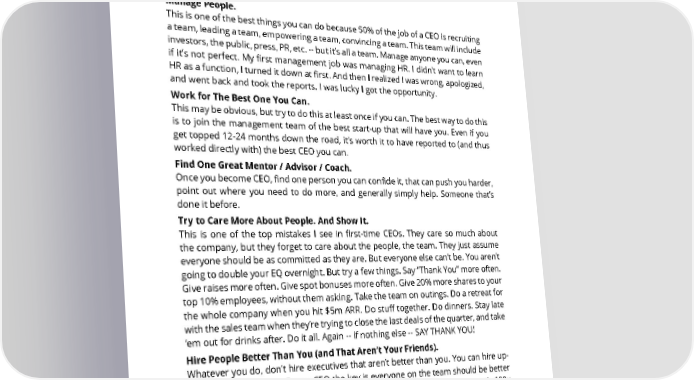 64. How do I prepare myself to become a successful startup CEO? My list of things that will help. Manage People. This is one of the best things you can do because 50% of the job of a CEO is recruiting a team, leading a team, empowering a team, convincing a team. This team will include investors, the public, press, PR, etc. -- but it’s all a team. Manage anyone you can, even if it’s not perfect. My first management job was managing HR. I didn’t want to learn HR as a function, I turned it down at first. And then I realized I was wrong, apologized, and went back and took the reports. I was lucky I got the opportunity. Work for The Best One You Can. This may be obvious, but try to do this at least once if you can. The best way to do this is to join the management team of the best start-up that will have you. Even if you get topped 12-24 months down the road, it’s worth it to have reported to (and thus worked directly with) the best CEO you can. Find One Great Mentor / Advisor / Coach. Once you become CEO, find one person you can confide it, that can push you harder, point out where you need to do more, and generally simply help. Someone that’s done it before. Try to Care More About People. And Show It. This is one of the top mistakes I see in first-time CEOs. They care so much about the company, but they forget to care about the people, the team. They just assume everyone should be as committed as they are. But everyone else can’t be. You aren’t going to double your EQ overnight. But try a few things. Say “Thank You” more often. Give raises more often. Give spot bonuses more often. Give 20% more shares to your top 10% employees, without them asking. Take the team on outings. Do a retreat for the whole company when you hit $5m ARR. Do stuff together. Do dinners. Stay late with the sales team when they’re trying to close the last deals of the quarter, and take ‘em out for drinks after. Do it all. Again -- if nothing else -- SAY THANK YOU! Hire People Better Than You (and That Aren’t Your Friends). Whatever you do, don’t hire executives that aren’t better than you. You can hire up- and-comers, that’s OK. But as CEO the key is everyone on the team should be better than you if possible. This isn’t a threat. It’s a way to make your equity worth 100x more. Before you are a CEO yourself, experiment here. Don’t just hire your friends, and don’t hire people that make you look good. Hire people insanely better than you, that look act and feel different. But that you 100% believe in. Amazing things will happen. You will learn so much here. SAASTR.COM 61