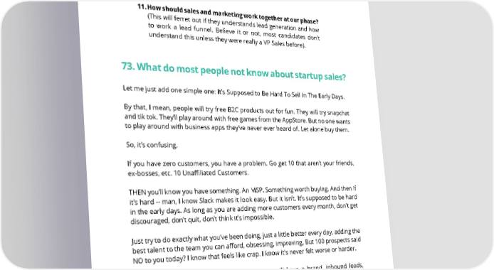 10. What will my revenues look like 120 days after I hire you? (Have him/her explain to you what will happen. There’s no correct answer. But there are many wrong answers). Ok let’s make it 11 actually: 11. How should sales and marketing work together at our phase? (This will ferret out if they understands lead generation and how to work a lead funnel. Believe it or not, most candidates don’t understand this unless they were really a VP Sales before). 73. What do most people not know about startup sales? Let me just add one simple one: It’s Supposed to Be Hard To Sell In The Early Days. By that, I mean, people will try free B2C products out for fun. They will try snapchat and tik tok. They’ll play around with free games from the AppStore. But no one wants to play around with business apps they’ve never ever heard of. Let alone buy them. So, it’s confusing. If you have zero customers, you have a problem. Go get 10 that aren’t your friends, ex-bosses, etc. 10 Unaffiliated Customers. THEN you’ll know you have something. An MSP. Something worth buying. And then if it’s hard -- man, I know Slack makes it look easy. But it isn’t. It’s supposed to be hard in the early days. As long as you are adding more customers every month, don’t get discouraged, don’t quit, don’t think it’s impossible. Just try to do exactly what you’ve been doing, just a little better every day, adding the best talent to the team you can afford, obsessing, improving. But 100 prospects said NO to you today? I know that feels like crap. I know it’s never felt worse or harder. It’s supposed to be like that for now. Later, you’ll have a brand, inbound leads, referrals, a demand gen engine, and all that. Until then ... it’s a day-to-day struggle and 1000 No’s. SAASTR.COM 70