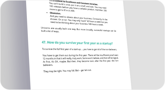 • A Minimum Viable Team. You can outsource development. You can do a single co-founder startup. But. Many folks start something without a truly Minimum Viable Team. No chance without it. You have to be able to build, ship, market, and sell your product. • Commitment to Excellence and Constant Iteration. You can’t build it once, put it on a shelf, and wait. You may need 100 releases before you have a sellable product. And then 200 more to get to $1m in ARR. • Obsession. And you need to obsess about your business. Constantly. In the shower. On a run. You may only “work” 40 hours a week but you need to be thinking about your business 140 hours a week. Unicorns are usually built one way. But more broadly, successful startups can be built a lot of ways. 47. How do you survive your first year as a startup? To survive the full first year of a start-up ... you have to get rid of the non-believers. You have to get them out during the first year. There will be insufficient proof even 12 months in that it will really, truly work. Some won’t believe, and that will be logical. At first, it’s OK, maybe. But then, they become toxic after the first year, the non- believers. They may be right. You may fail. But -- get ‘em out. SAASTR.COM 43