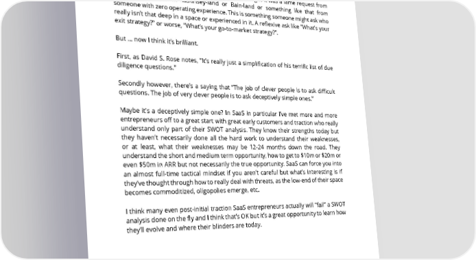 43. A potential investor just asked to see my SWOT analysis. Is this normal? It’s not normal. When I first read the question I thought it was a lame request from someone schooled in McKinsey-land or Bain-land or something like that from someone with zero operating experience. This is something someone might ask who really isn’t that deep in a space or experienced in it. A reflexive ask like “What’s your exit strategy?” or worse, “What’s your go-to-market strategy?”. But ... now I think it’s brilliant. First, as David S. Rose notes, “It’s really just a simplification of his terrific list of due diligence questions.” Secondly however, there’s a saying that “The job of clever people is to ask difficult questions. The job of very clever people is to ask deceptively simple ones.” Maybe it’s a deceptively simple one? In SaaS in particular I’ve met more and more entrepreneurs off to a great start with great early customers and traction who really understand only part of their SWOT analysis. They know their strengths today but they haven’t necessarily done all the hard work to understand their weaknesses, or at least, what their weaknesses may be 12-24 months down the road. They understand the short and medium term opportunity, how to get to $10m or $20m or even $50m in ARR but not necessarily the true opportunity. SaaS can force you into an almost full-time tactical mindset if you aren’t careful but what’s interesting is if they’ve thought through how to really deal with threats, as the low-end of their space becomes commoditized, oligopolies emerge, etc. I think many even post-initial traction SaaS entrepreneurs actually will “fail” a SWOT analysis done on the fly and I think that’s OK but it’s a great opportunity to learn how they’ll evolve and where their blinders are today. SAASTR.COM 38
