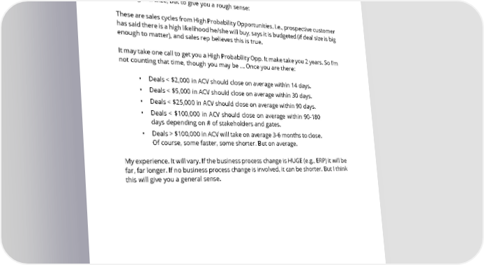 78. What is a good benchmark for B2B SaaS sales cycles? What factors/characteristics effect this number: size of the deal, complexity of the product, etc.? To overgeneralize, but to give you a rough sense: These are sales cycles from High Probability Opportunities. I.e., prospective customer has said there is a high likelihood he/she will buy, says it is budgeted (if deal size is big enough to matter), and sales rep believes this is true. It may take one call to get you a High Probability Opp. It make take you 2 years. So I’m not counting that time, though you may be ... Once you are there: • Deals < $2,000 in ACV should close on average within 14 days. • Deals < $5,000 in ACV should close on average within 30 days. • Deals < $25,000 in ACV should close on average within 90 days. • Deals < $100,000 in ACV should close on average within 90-180 days depending on # of stakeholders and gates. • Deals > $100,000 in ACV will take on average 3-6 months to close. Of course, some faster, some shorter. But on average. My experience. It will vary. If the business process change is HUGE (e.g., ERP) it will be far, far longer. If no business process change is involved, it can be shorter. But I think this will give you a general sense. SAASTR.COM 75