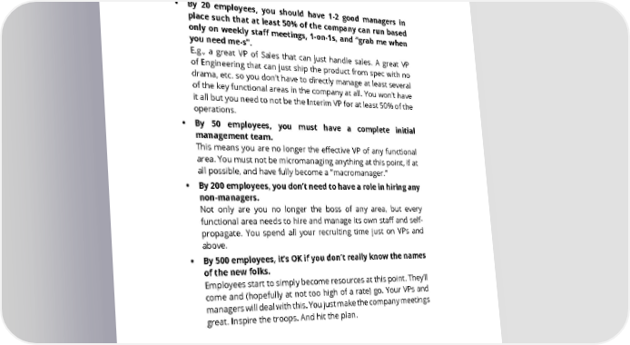65. When should a CEO of a startup stop “doing the work” and let the others do the work? My general learnings: • By 20 employees, you should have 1-2 good managers in place such that at least 50% of the company can run based only on weekly staff meetings, 1-on-1s, and “grab me when you need me-s”. E.g., a great VP of Sales that can just handle sales. A great VP of Engineering that can just ship the product from spec with no drama, etc. so you don’t have to directly manage at least several of the key functional areas in the company at all. You won’t have it all but you need to not be the Interim VP for at least 50% of the operations. • By 50 employees, you must have a complete initial management team. This means you are no longer the effective VP of any functional area. You must not be micromanaging anything at this point, if at all possible, and have fully become a “macromanager.” • By 200 employees, you don’t need to have a role in hiring any non-managers. Not only are you no longer the boss of any area, but every functional area needs to hire and manage its own staff and self- propagate. You spend all your recruiting time just on VPs and above. • By 500 employees, it’s OK if you don’t really know the names of the new folks. Employees start to simply become resources at this point. They’ll come and (hopefully at not too high of a rate) go. Your VPs and managers will deal with this. You just make the company meetings great. Inspire the troops. And hit the plan. SAASTR.COM 62
