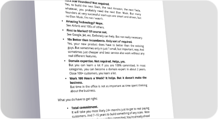 46. What are the things startups have to get right? Let’s split this into two distinct categories. Let’s first talk about what you don’t have to get right: • Rock star Founders? Not required. Yes, to build the next Slack, the next Amazon, the next Tesla, whatever, you probably need the next Elon Musk. But many founders at very successful start-ups are smart and driven, but no Elon Musk. I’m not / wasn’t. • Amazing Technology? Nope. See Airbnb and 100s of others. • First to Market? Of course not. See Google, Jet, etc. Definitely can help. But not really necessary. • 10x Better than Incumbents. Only sort of required. Yes, your new product does have to better than the existing guys. But sometimes only in just 1 small, but important, way. And sometimes just cheaper and best service also work without any real different features. • Domain expertise. Not required. Helps, yes. But you can learn a lot if you are 100% committed. In most categories, you can become a domain expert in about 2 years. Close 100+ customers, you learn a lot. • Work 100 Hours a Week? It helps. But it doesn’t make the business. But time in the office is not as important as time spent thinking about the business. What you do have to get right: • Total commitment. It will take you most likely 24+ months just to get to real paying customers. And 7–10 years to build something of any scale. Most so-called “founders” are not this committed. You’re already ahead of 98% of the folks at WeWork and Galvanize if you are 100% committed to doing the time. • Product-market fit. You do have to eventually get to a minimum sellable product. You have to find a product the market wants to buy. SAASTR.COM 42
