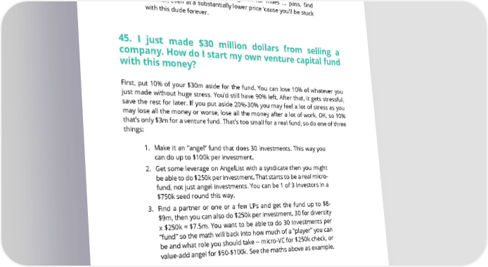 • Ultimately, you want someone that has your back. Truely, it’s not about you, it’s about the company but it’s your company. Pick the best VC for you but pick someone that has your back. If you don’t feel it ... even if the brand is right, the background is right, the smiles go on for miles ... pass, find another, even at a substantially lower price ‘cause you’ll be stuck with this dude forever. 45. I just made $30 million dollars from selling a company. How do I start my own venture capital fund with this money? First, put 10% of your $30m aside for the fund. You can lose 10% of whatever you just made without huge stress. You’d still have 90% left. After that, it gets stressful, save the rest for later. If you put aside 20%-30% you may feel a lot of stress as you may lose all the money or worse, lose all the money after a lot of work. OK, so 10% that’s only $3m for a venture fund. That’s too small for a real fund, so do one of three things: 1. Make it an “angel” fund that does 30 investments. This way you can do up to $100k per investment. 2. Get some leverage on AngelList with a syndicate then you might be able to do $250k per investment. That starts to be a real micro- fund, not just angel investments. You can be 1 of 3 investors in a $750k seed round this way. 3. Find a partner or one or a few LPs and get the fund up to $8- $9m, then you can also do $250k per investment. 30 for diversity x $250k = $7.5m. You want to be able to do 30 investments per “fund” so the math will back into how much of a “player” you can be and what role you should take -- micro-VC for $250k check, or value-add angel for $50-$100k. See the maths above as example. SAASTR.COM 40