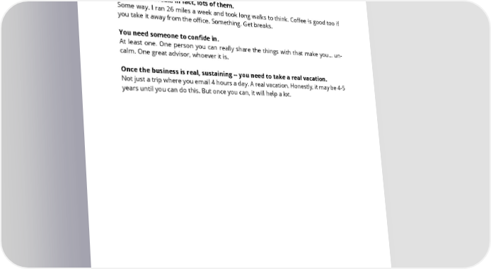 Ideally, 1, 2, or 3 others on the management team that can really help carry the load. So you don’t have to worry about 1, 2 or 3 key functional areas, at least not at an execution level. If you don’t have true help carrying the load -- stop. Do almost nothing else. Recruit someone. You need a break. In fact, lots of them. Some way. I ran 26 miles a week and took long walks to think. Coffee is good too if you take it away from the office. Something. Get breaks. You need someone to confide in. At least one. One person you can really share the things with that make you... un- calm. One great advisor, whoever it is. Once the business is real, sustaining -- you need to take a real vacation. Not just a trip where you email 4 hours a day. A real vacation. Honestly, it may be 4-5 years until you can do this. But once you can, it will help a lot. SAASTR.COM 19