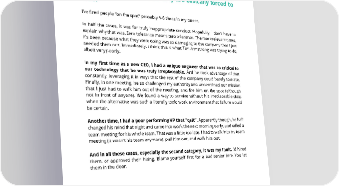 92. How do so many CEOs fire people on the spot without any apparent consequence? Does some HR rep take them into a room and offer them a severance package and legal document which they are basically forced to take? I’ve fired people “on the spot” probably 5-6 times in my career. In half the cases, it was for truly inappropriate conduct. Hopefully, I don’t have to explain why that was. Zero tolerance means zero tolerance. The more relevant times, it’s been because what they were doing was so damaging to the company that I just needed them out. Immediately. I think this is what Tim Armstrong was trying to do, albeit very poorly. In my first time as a new CEO, I had a unique engineer that was so critical to our technology that he was truly irreplaceable. And he took advantage of that constantly, leveraging it in ways that the rest of the company could barely tolerate. Finally, in one meeting, he so challenged my authority and undermined our mission that I just had to walk him out of the meeting, and fire him on the spot (although not in front of anyone). We found a way to survive without his irreplaceable skills when the alternative was such a literally toxic work environment that failure would be certain. Another time, I had a poor performing VP that “quit”. Apparently though, he half changed his mind that night and came into work the next morning early, and called a team meeting for his whole team. That was a little too late. I had to walk into his team meeting (it wasn’t his team anymore), pull him out, and walk him out. And in all these cases, especially the second category, it was my fault. I’d hired them, or approved their hiring. Blame yourself first for a bad senior hire. You let them in the door. SAASTR.COM 90