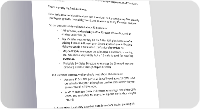 85. What are a SaaS startup’s first 100 hires? HIRING Let’s assume you don’t have massive amounts of venture funding. Ok, then we can assume say $150k-$200k in revenues per employee, or a $15m-$20m &OPERATIONS ARR business. That’s a pretty big SaaS business. Now let’s assume it’s sales-driven (not freemium) and growing at say 70% annually (not hyper-growth, but solid growth), and so wants to hit say $34m ARR next year. So on the Sales side we’ll need about 40 headcount: • 1 VP of Sales, and probably a VP or Director of Sales Ops, and an analyst under her (3) • Say 25 sales reps to fully hit the $34m ARR plan because we’re adding $14m in ARR next year. (That’s a yielded quota). If cash is tight we can do it on less but that’s a lot of growth to hit. • Maybe 8 SDRs to support the sales reps in outbound, screening, etc. Situations vary wildly, but a 1:3 ratio is good for modeling purposes. • Probably 3-4 Sales Directors to manage the 25 reps (8 reps per director), and the SDRs (8-10 per director). In Customer Success, we’ll probably need about 20 headcount: • Assume $1.5m ARR per CSM. So we’ll need about 20 CSMs to hit our plan for the year, although we can hire some later in the year, so we can call it 15 for now, • A VP to manage them, 2 directors to manage half of the CSMs each, and probably an analyst to support her in data analysis, etc. (4). In Marketing, it can vary based on outside vendors, but I’m guessing 4-8: • VP Marketing • Director Demand Gen • Director, Field Marketing (events, etc.) • Content Marketing • Product Marketing • Probably, own lead qualification reps to manage the MQLs (2-3). SAASTR.COM 83