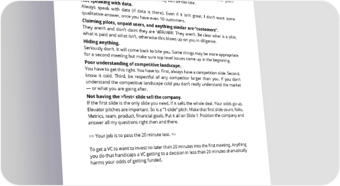 Thomas Jefferson Elementary is not. I want to hear why the founders are amazing. Not answering the questions. Should I ask a question, there’s a good reason. Some VCs like to hear themselves talk. I don’t. Just answer it. If you don’t know the answer, tell me. Don’t tell me “you’ll get to that later” because if you do, that may well be too late. Not speaking with data. Always speak with data (if data is there). Even if it isn’t great. I don’t want some qualitative answer, once you have even 10 customers. Claiming pilots, unpaid users, and anything similar are “customers”. They aren’t and don’t claim they are MRR/ARR. They aren’t. Be clear what is a pilot, what is paid and what isn’t, otherwise this blows up on you in diligence. Hiding anything. Seriously don’t. It will come back to bite you. Some things may be more appropriate for a second meeting but make sure top level issues come up in the beginning. Poor understanding of competitive landscape. You have to get this right. You have to. First, always have a competition slide. Second, know it cold. Third, be respectful of any competitor larger than you. If you don’t understand the competitive landscape cold you don’t really understand the market — or what you are going after. Not having the >first< slide sell the company. If the first slide is the only slide you need. If it sells the whole deal. Your odds go up. Elevator pitches are important. So is a “1-slide” pitch. Make that first slide count, folks. Metrics, team, product, financial goals. Put it all on Slide 1. Position the company and answer all my questions right then and there. >> Your job is to pass the 20 minute test. << To get a VC to want to invest no later than 20 minutes into the first meeting. Anything you do that handicaps a VC getting to a decision in less than 20 minutes dramatically harms your odds of getting funded. SAASTR.COM 22