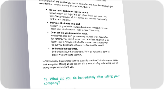 18. What should I do after my startup failed? If it “failed” after < 12 months or so it doesn’t matter too much. No one will care and there’s no need to explain yourself, apologize, or feel like a failure. No need. Dust yourself off and decide if you want to do another one. If you do — the key is, just consider that one-year start-up an experience. That’s it: • Be matter-of-fact about the experience. I know it wasn’t just “a job” but sort of act almost as if it was. You tried. You gave it your all. You learned and it’s done. You’re ready for the next challenge. • Don’t act like it was a big deal. It wasn’t (in good and bad ways). I don’t want to hear 20 minutes about your failed start-up. I want to hear 120 seconds. • Don’t act like you learned that much. You learned a lot, don’t get me wrong. You took a risk. You worked for nothing. You tried. I respect that. But if you never got to at least $100k in ARR you didn’t build a business. You started a start- up but you didn’t build a >business<. Don’t act like you did. • Be humble but not bitter. Be humble about the experience. We’re all human but don’t be bitter. We don’t like to see that. In Silicon Valley, a quick failed start-up, especially one that didn’t raise any real money isn’t a negative. Making a huge deal out of it is a maturity flag and dwelling on it will worry people working with you. 19. What did you do immediately after selling your company? In terms of the first days / week ... When I sold my first company as a co-founder I didn’t have any post-closing obligations. I finished up in 8 days, took a long weekend at the beach with my wife and good friend, decompressed for the first time since co-founding, bought my wife a house and a new car, and then just kicked back for 9 months. SAASTR.COM 16